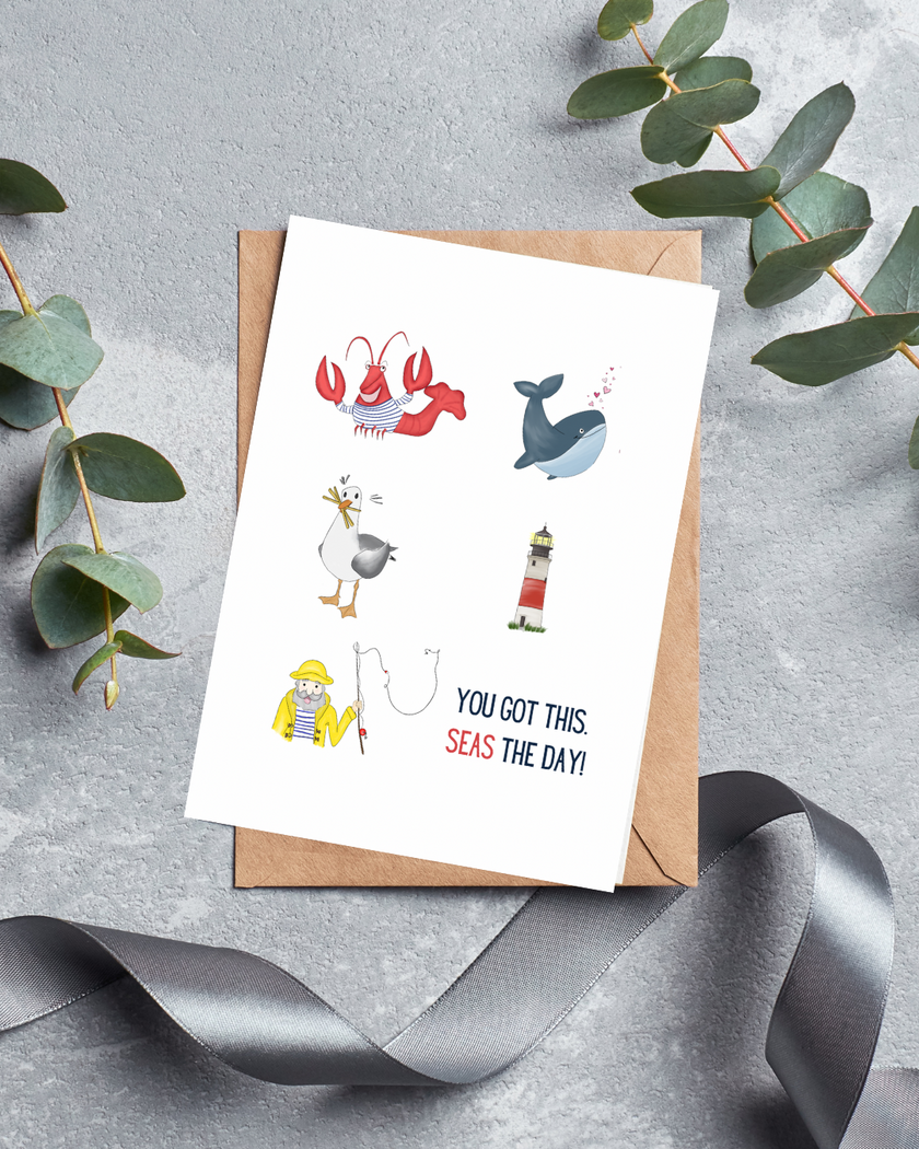 Set sail for new beginnings with this "Seas the Day" greeting card! This nautical-inspired card is perfect for letting friends and family know you're wishing them well, no matter the distance. East coast vibes meet motivational messages, so you can feel great sending this out for all occasions. Let your loved ones know you're cheering them on - buy now and make waves!