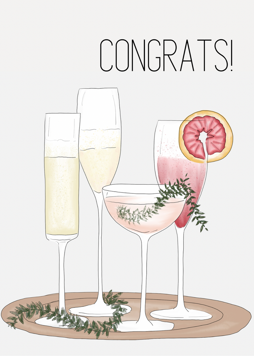 Raise a glass & say "Congrats!" to the happy couple with this celebratory 4.25x5.5" card! With its fancy fonts and playful cocktails, it'll be the perfect way to wish them luck in their future adventures. Cheers to a night of celebrations! 🥂