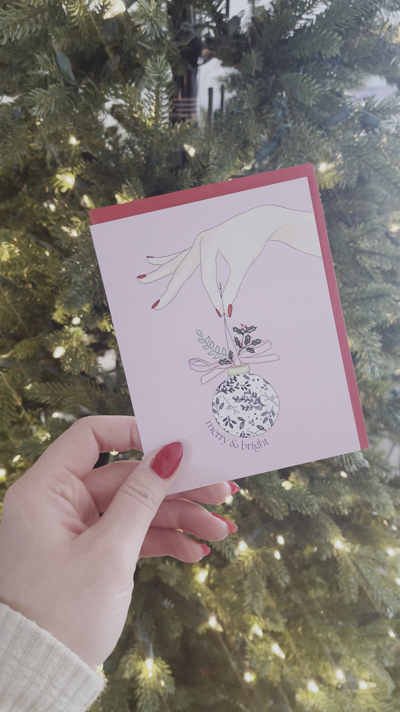 Make somebody's Christmas merry and bright with this playful 4.25" x 5.5" card! Featuring a festive hand decorated in pink peppermints, fancy ornaments, and a cheerful "Merry & Bright" greeting, this watercolour card is a must-have for pink lovers everywhere!